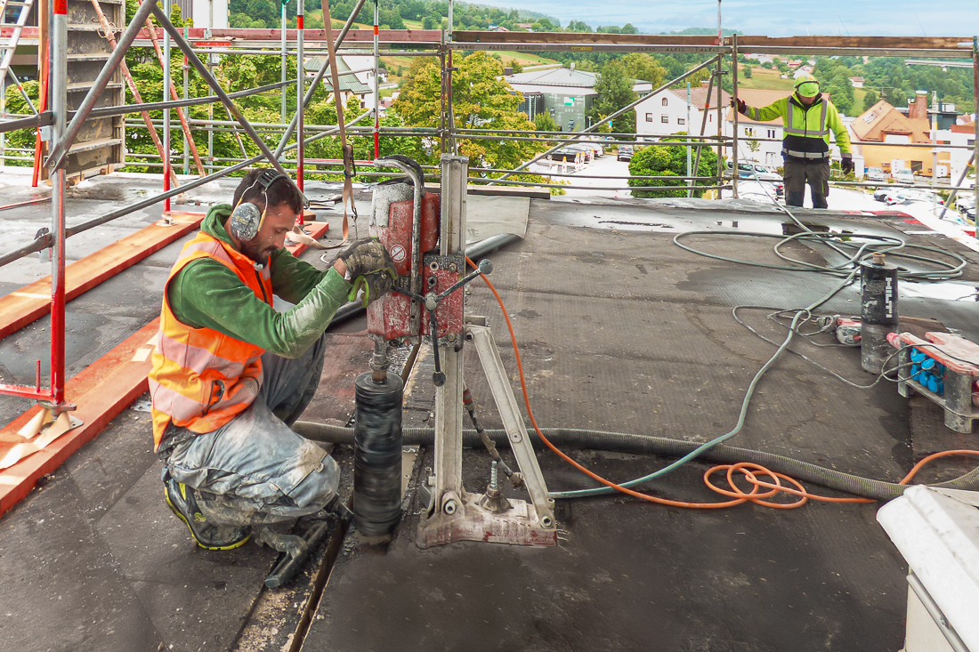 Um den Bestand nicht zu beeinträchtigen, wurden die späteren Deckenausschnitte zunächst durch gezielte Eckbohrungen vorbereitet. Dank unserer modern ausgestatteten Kernbohrsysteme war es möglich, präzise und mit minimalem Wasserverbrauch zu arbeiten – ein entscheidender Faktor, um das Risiko von Wassereintritt in die aktiv genutzten Klinikbereiche zuverlässig zu vermeiden. Nach Abschluss der Arbeiten wurden die gelösten Betonteile – insgesamt rund 100 Tonnen Stahlbeton – noch am selben Tag per Hochbaukran ausgehoben und abtransportiert. So konnten die Öffnungen unmittelbar im Anschluss sicher abgedichtet werden.